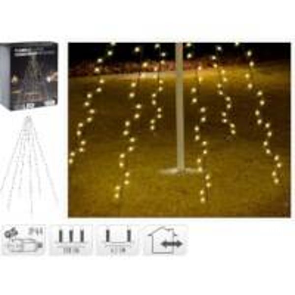 De vlaggenmast verlichting is makkelijk te bevestigen door de bovenkant vast te maken aan de vlaggenmast. Zo vallen de strengen naar beneden en kunt u elke streng vastmaken in de grond, zodat u een mooi kerstboomeffect krijgt. De verlichting bestaat uit 6 strengen met daarin in totaal 192 Led lampjes. De strengen zijn ieder 208 cm lang. Het snoer heeft een lengte van 5 meter.